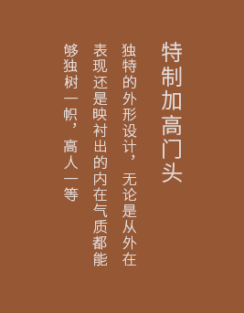 | 秉承中國“藏風(fēng)聚!钡膫鹘y(tǒng)理念,研發(fā)出特殊的設(shè)計(jì)工藝,無需更改門洞尺寸,加高門框處理,添財(cái)納吉祥、五福入豪門 |